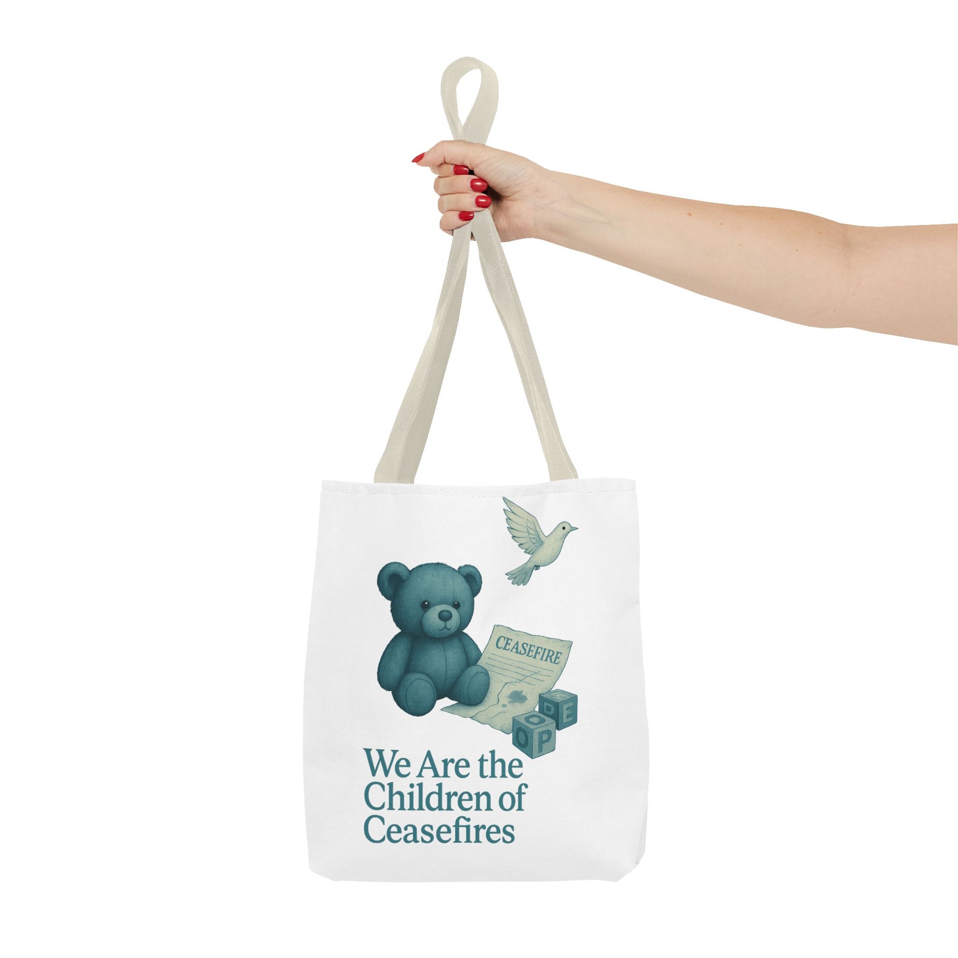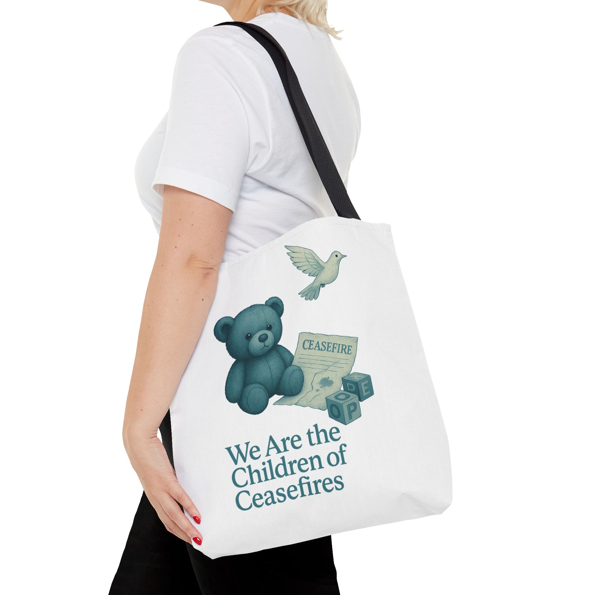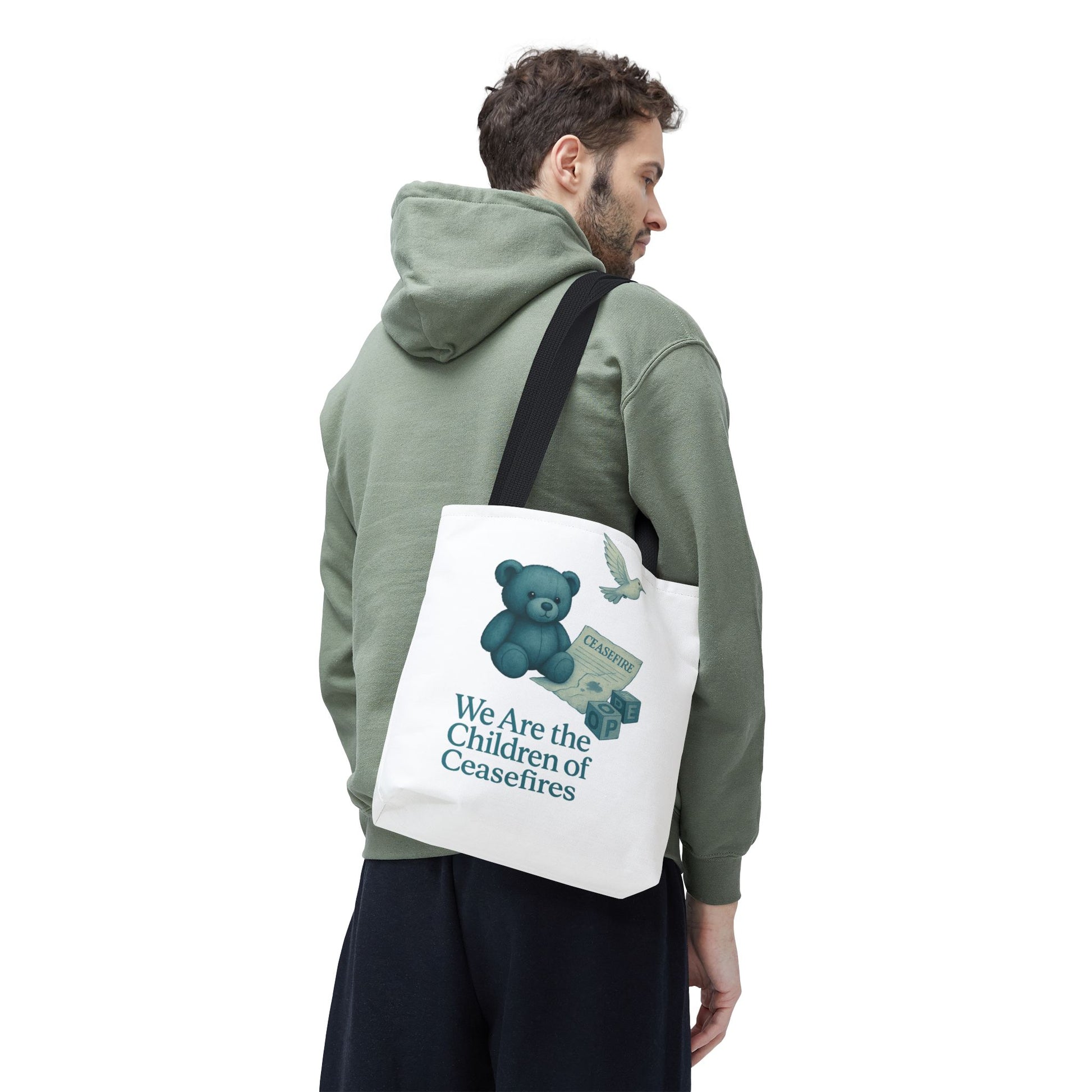 This emotionally powerful tote bag features our “Children of Ceasefires” design — a hauntingly gentle image of a teddy bear holding a ceasefire paper beside blocks that spell “HOPE.” Behind him, ruins and a white dove rise as symbols of broken truces and fragile futures.