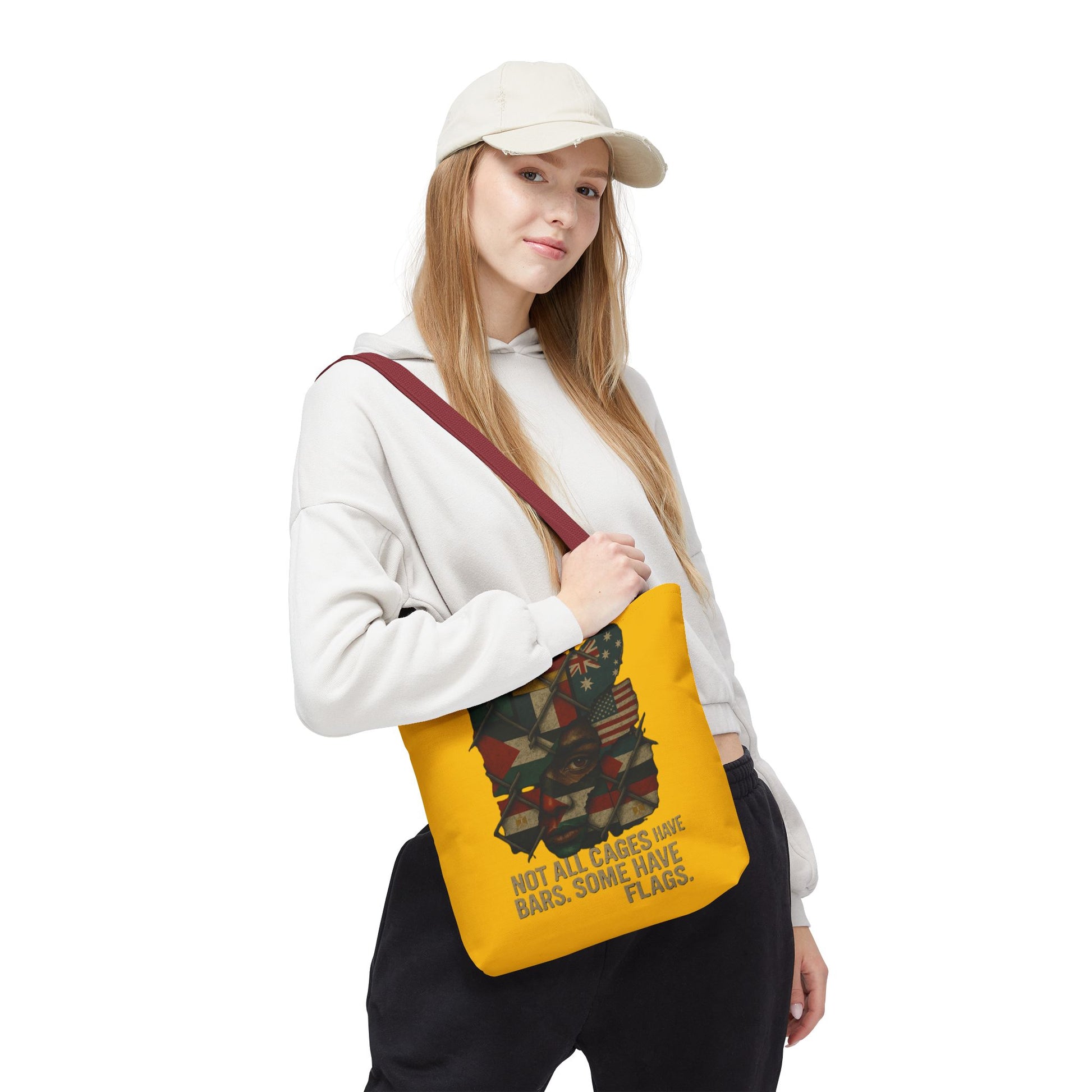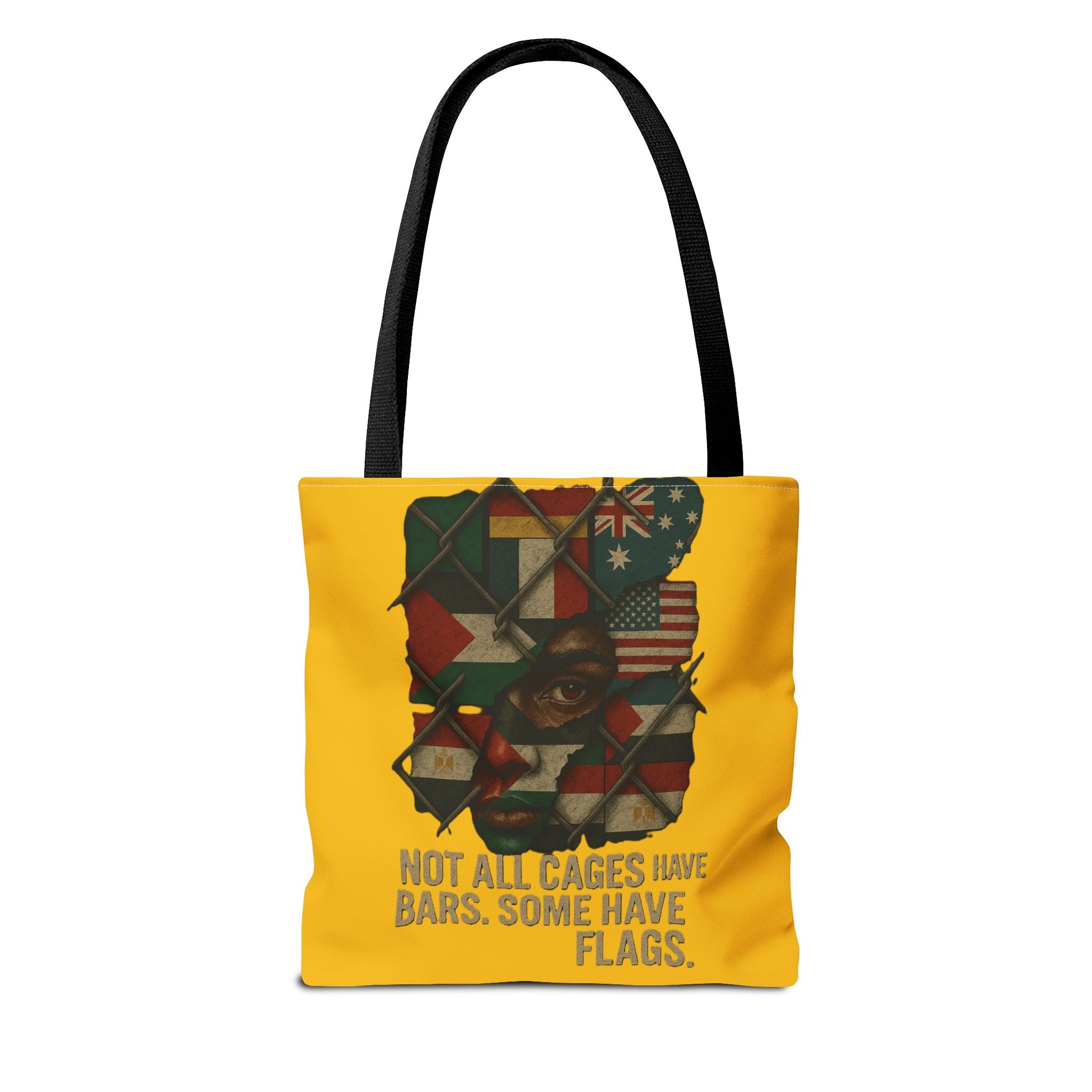 Carry the message everywhere you go. This sturdy tote bag features the “Not All Cages Have Flags” artwork, perfect for daily errands, activism events, or as a meaningful gift. Available in natural and black for versatile styling.